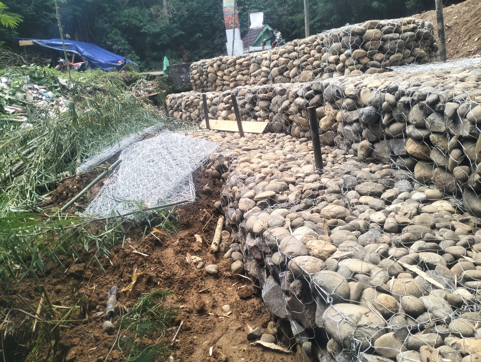 Diketahui, pekerjaan baru mencapai tiga baris bronjong yang telah terpasang, namun kondisinya sudah memprihatinkan.