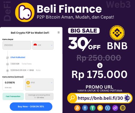 Beli Finance, dalam kolaborasi dengan CryptoWatch.ID, meluncurkan platform terbaru mereka, P2P Beli Finance. Untuk merayakan peluncuran ini, mereka menawarkan promosi eksklusif berupa diskon 30% untuk pembelian Token BNB, namun hanya untuk 100 pembeli pertama. P2P Beli Finance adalah platform keuangan terdesentralisasi yang memudahkan proses onramp dari fiat ke kripto, memungkinkan pengguna membeli mata uang kripto langsung dari pengguna lain dengan aman dan efisien. Untuk mendapatkan diskon ini, pengguna cukup mengunjungi https://bnb.beli.fi/30 dan menggunakan kode promo yang tersedia