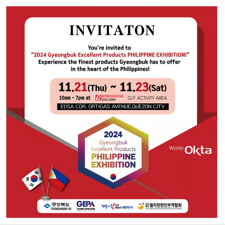 Overseas Korea Traders Association (OKTA) in the Philippines in organizing the Gyeongbuk Excellent Products Philippines Exhibition 2024 on November 21-23, 2024 at Robinsons Galleria Activity Area, Pasig City, 25 Korean Companies will exhibit their products including but not limited to; agricultural products, cosmetics and skin care, , food, drinks and condiments, home essentials and pet foods and vitamins