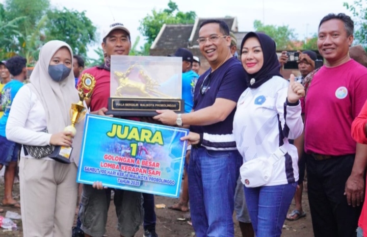 Wali Kota dr. Aminuddin, didampingi istri yang juga Ketua TP PKK Kota Probolinggo, dr. Evariani, turut menyaksikan langsung jalannya perlombaan. “Saya ucapkan terima kasih kepada panitia, dan selamat untuk para pemenang yang sudah menunjukkan kemampuan terbaiknya hari ini. Karapan sapi ini bukan hanya lomba, tapi juga identitas budaya yang harus kita jaga bersama,” ucapnya penuh semangat.