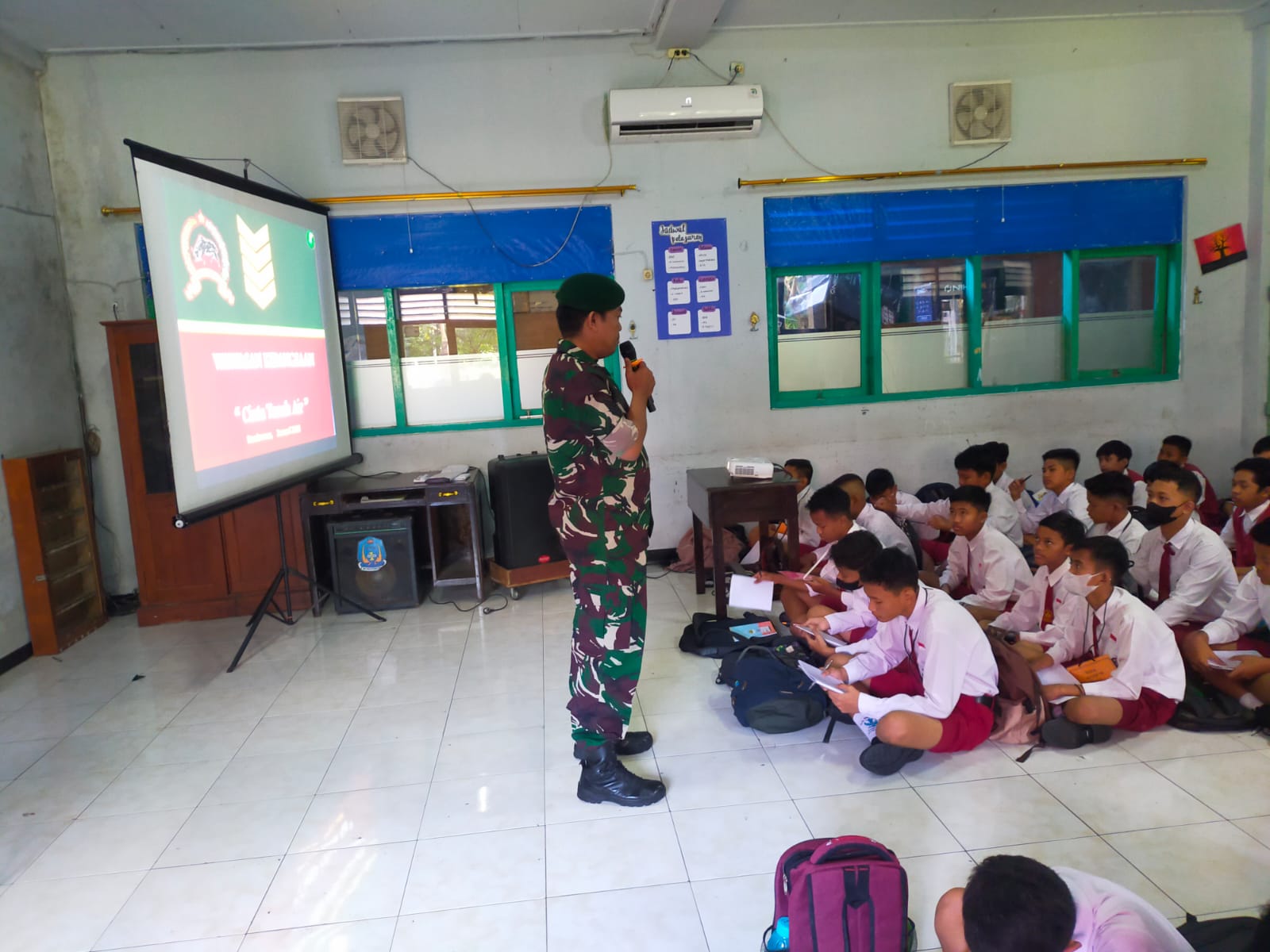 Bondowoso, FAKTUAL.CO.ID – Anggota Koramil 0822/01 Bondowoso Serma Supriyadi, melaksanakan kegiatan Wawasan Kebangsaan memberikan materi Bela Negara kepada siswa siswi SMPN 01 Bondowoso, Senin (17/7/2023).