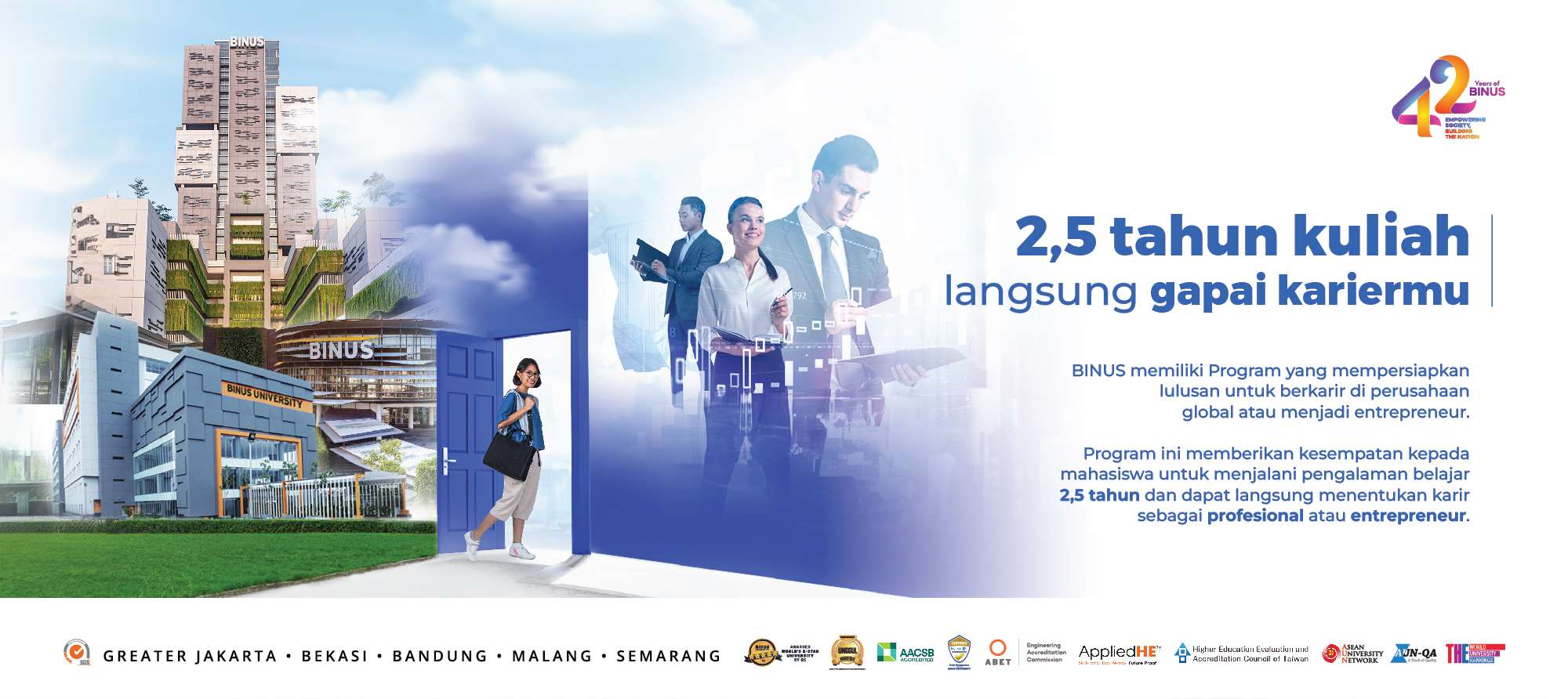 BINUS UNIVERSITY menawarkan sistem pembelajaran holistik yang memungkinkan mahasiswa mengembangkan keterampilan adaptif dan berdampak positif pada masyarakat dalam waktu 2,5 tahun untuk bisa langsung menggapai karir, dengan berbagai program penguatan seperti magang, kewirausahaan, penelitian, dan studi di luar negeri. Ini mencerminkan komitmen universitas untuk menghasilkan lulusan yang siap bersaing dan berinovasi dalam dunia kerja yang terus berkembang serta menjadi agen perubahan positif.