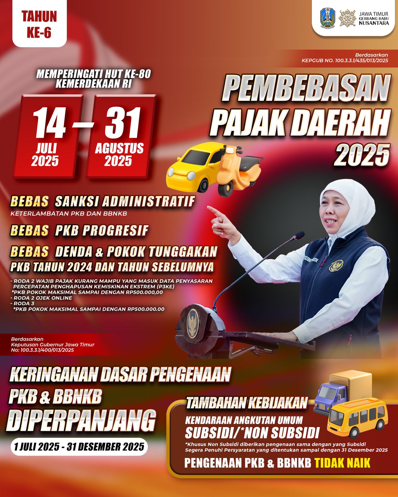 Selain itu juga dikeluarkan Keputusan Gubernur Jawa Timur nomor : 100.3.3.1/400/013/2025 tentang Keringanan Dasar Pengenaan Pajak Kendaraan Bermotor (PKB) dan Bea Balik Nama Kendaraan Bermotor (BBNKB). Keputusan ini diperpanjang mulai dari 1 Juli hingga 31 Desember 2025.
