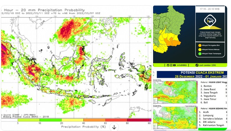 - Prakiraan 3 Harian: memperkirakan potensi hujan, petir, dan angin kencang dalam skala provinsi.