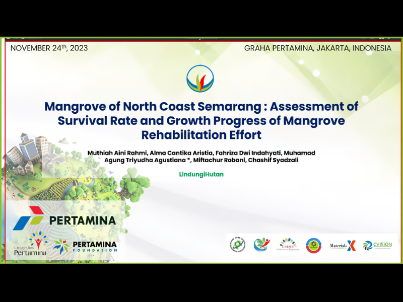 LindungiHutan memaparkan hasil penelitian tingkat survival rate dan growth rate dari penanaman mangrove terutama di wilayah pesisir utara Semarang dan sekitarnya dalam acara “2nd International Conference on Nature-Based Solution in Climate Change 2023” yang diselenggarakan oleh Pertamina pada 24 November 2023.