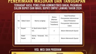 Empat Lawang, FAKTUAL.CO.ID – Dengan diumumkannya hasil verifikasi administrasi berkas pencalonan H Budi Antoni Aljufri…