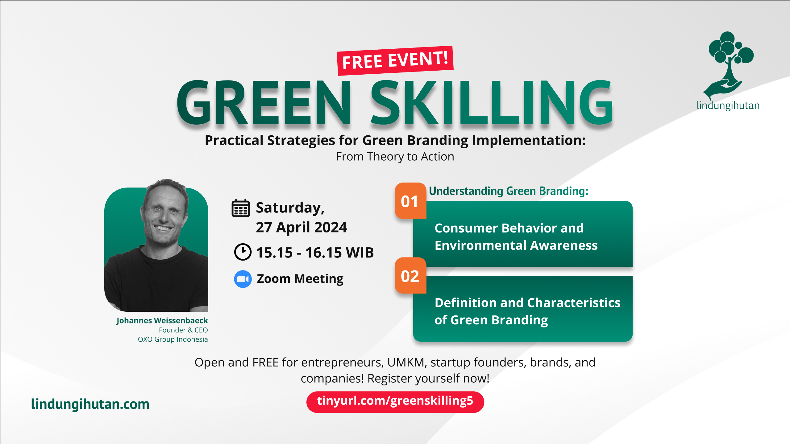 Webinar ini dihadiri oleh Founder & CEO OXO Group Indonesia, Johannes Weissenbaeck, sebagai narasumber utama yang akan membahas mengenai strategi, studi kasus hingga dampak dari Green Branding terhadap kelangsungan bisnis perusahaan.